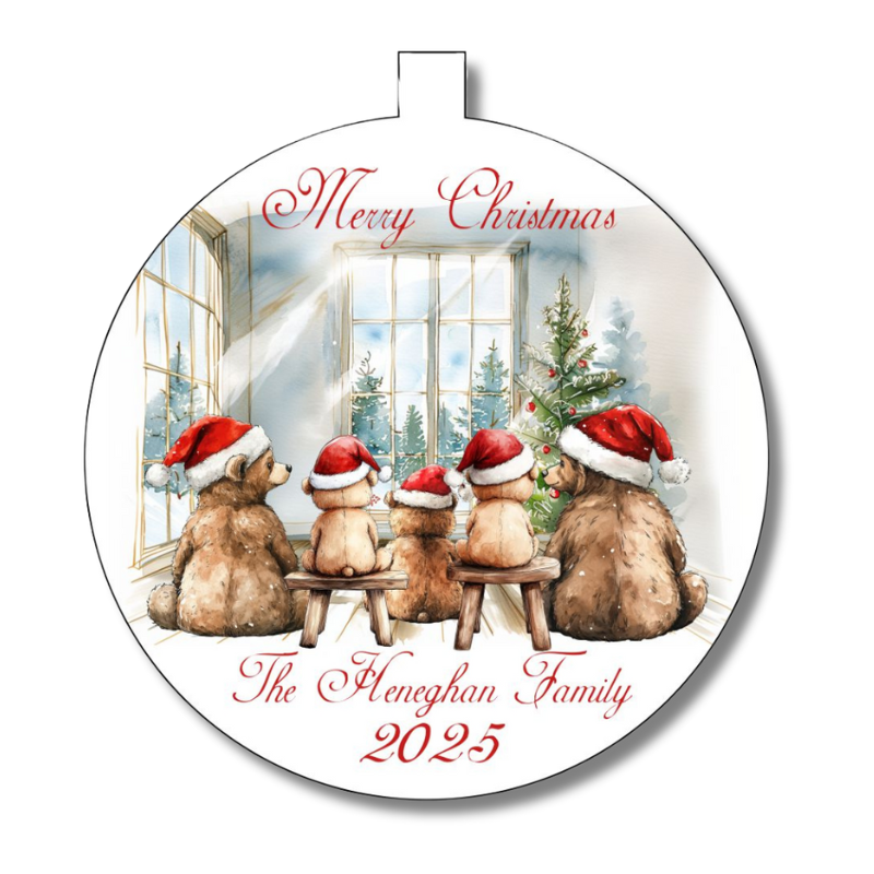 Bring festive cheer to your tree with this delightful Bear Family Christmas Bauble! Personalise it with your family's names to create a one-of-a-kind keepsake that celebrates your loved ones. Perfect for first Christmas memories, new families, or adding a heartwarming touch to your holiday decorations. This charming bauble makes a thoughtful gift that'll be treasured year after year. Watch it sparkle on your tree and smile every time you spot those adorable bears!