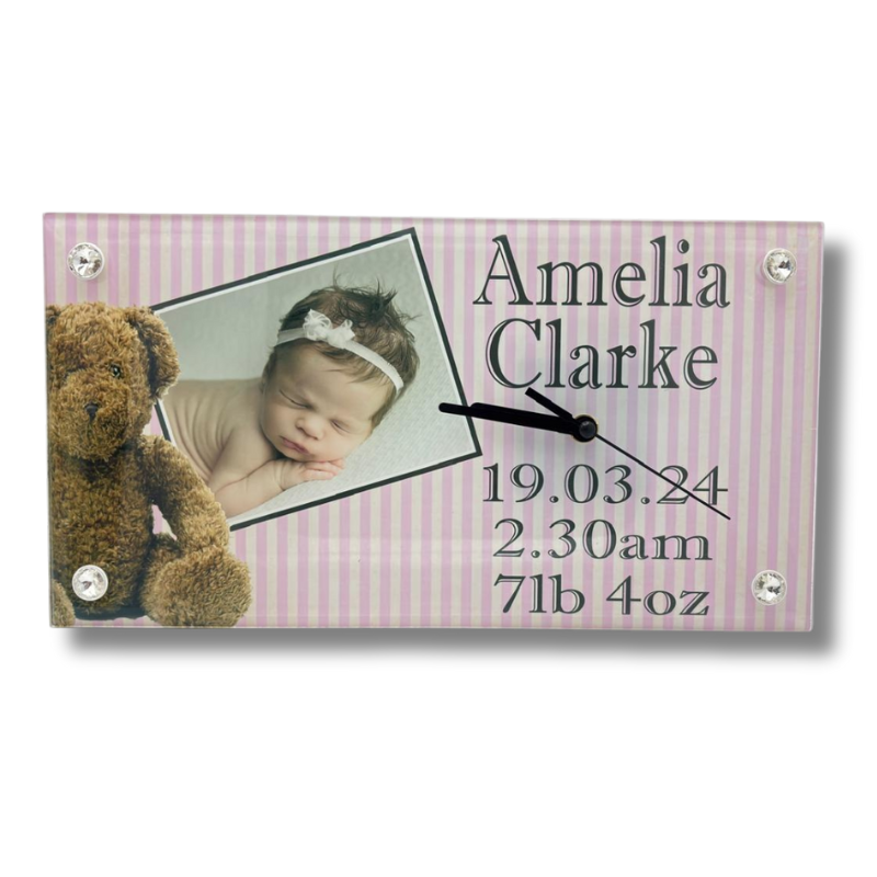 Enjoy timeless memories with the Glass Baby Clock, a personalised gift that adds charm to any nursery. Made with durable and elegant glass, this clock will stand the test of time. Perfect for a newborn or child's room, it's a unique and thoughtful present that will be treasured for years to come.